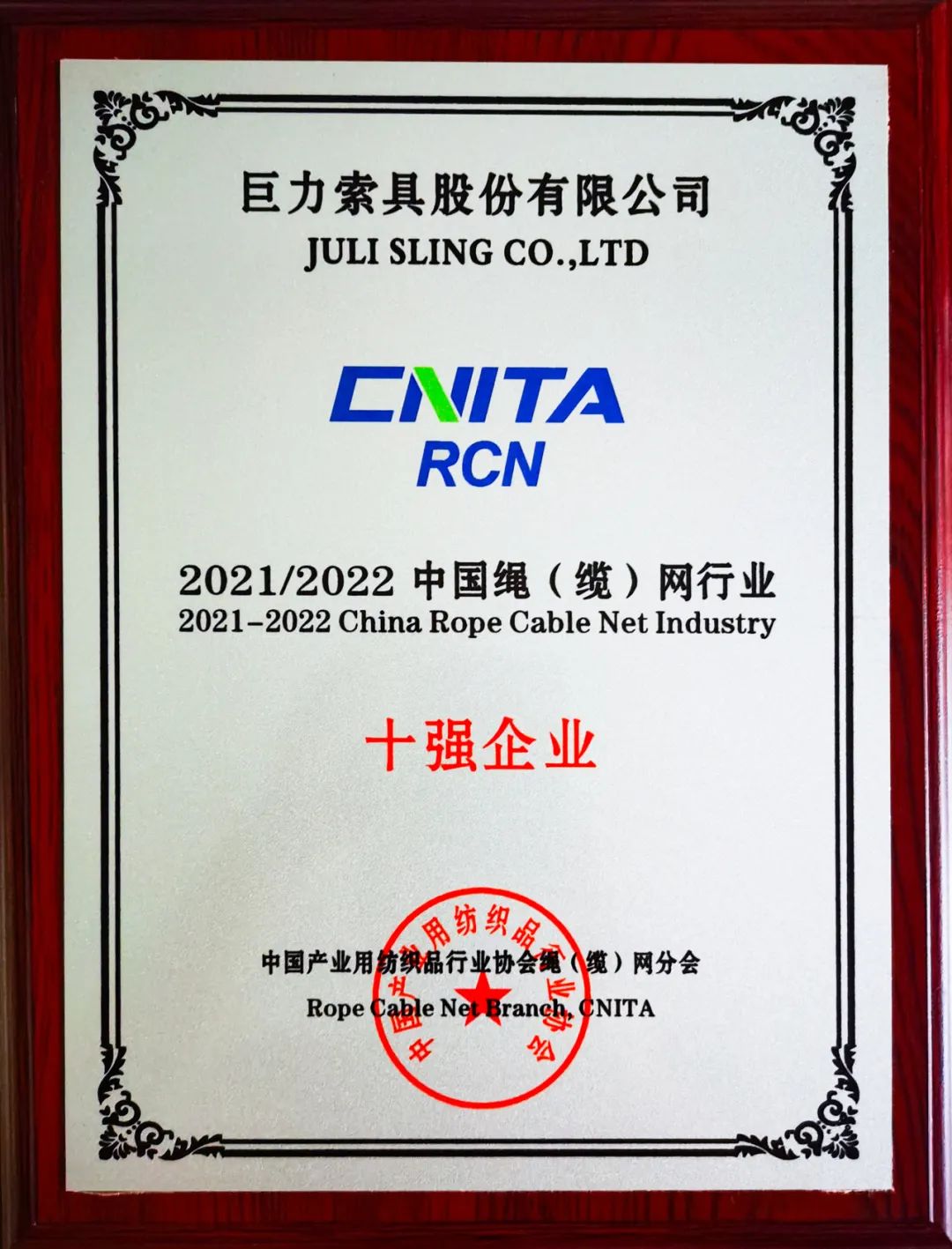 巨力索具榮獲“2021/2022中國繩(纜)網(wǎng)行業(yè)十強(qiáng)企業(yè)”