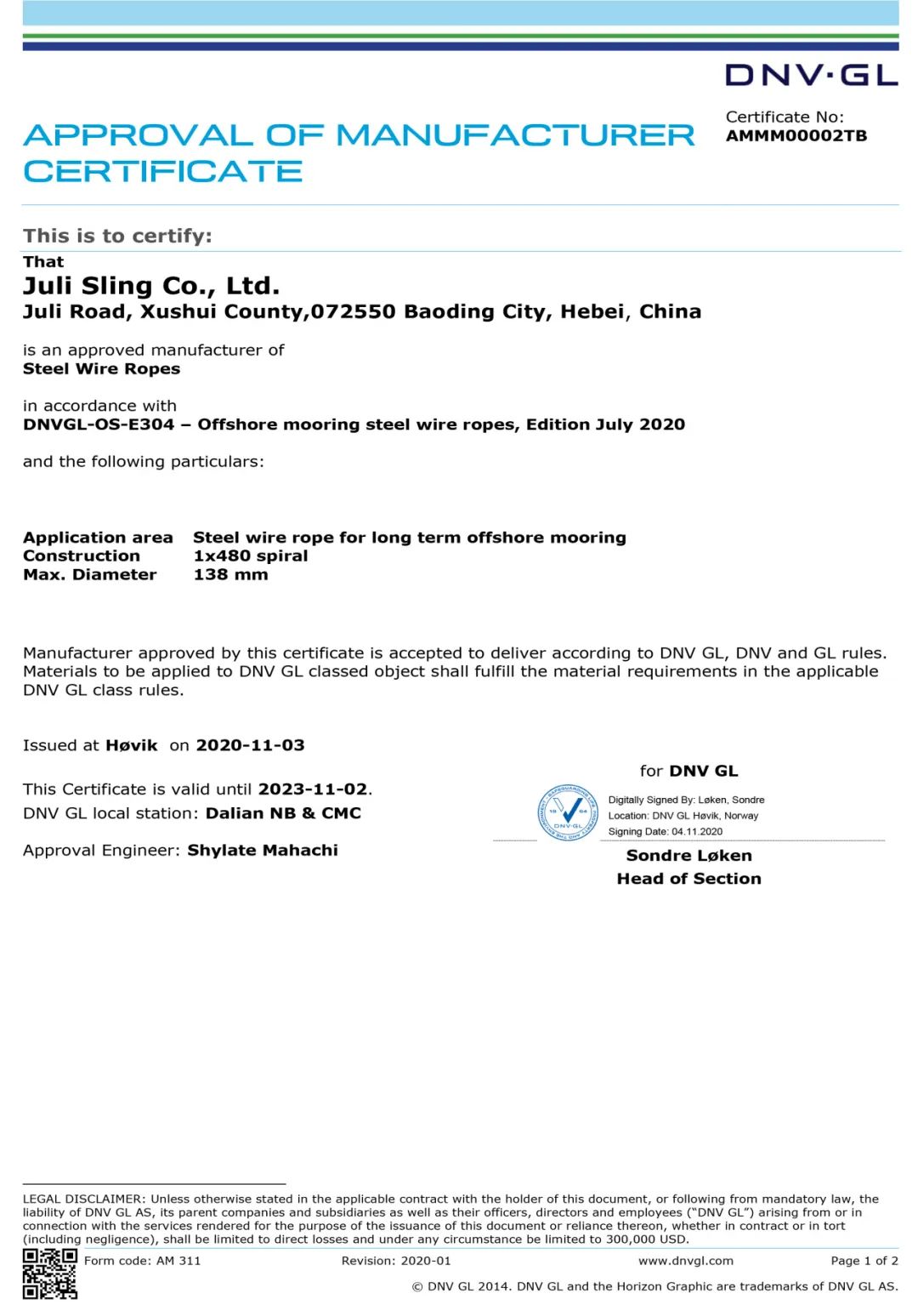 (DNV長期系泊鋼絲繩接頭及纜繩套環(huán)鍛件工廠認可證書)