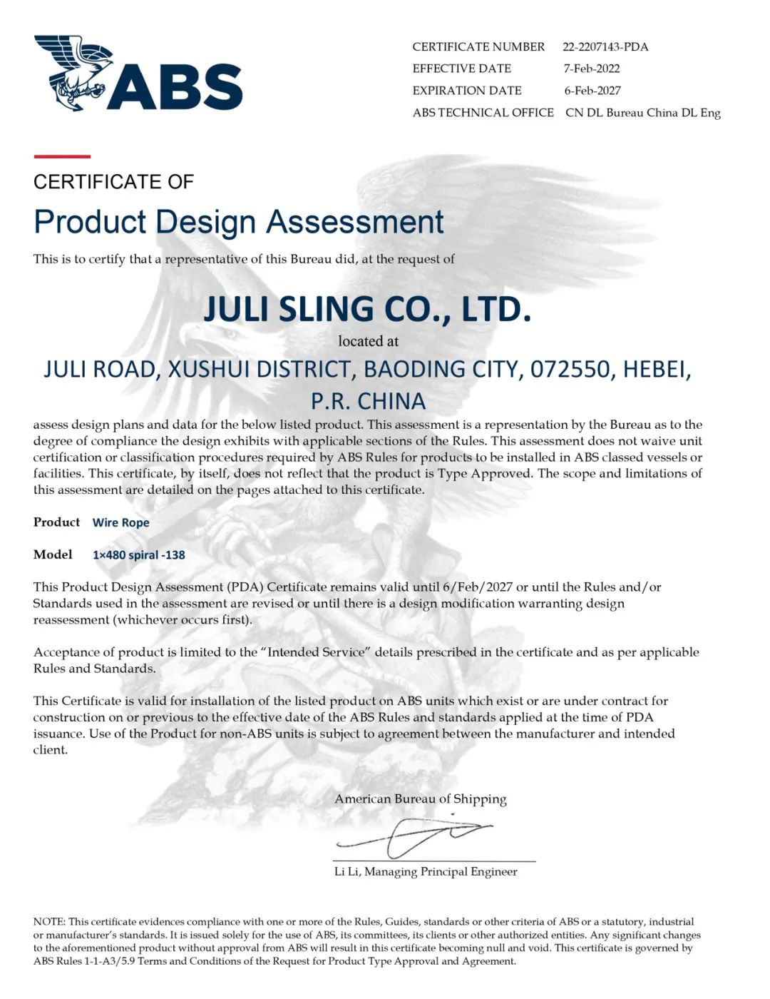 結(jié)合2020年單股鋼絲繩DNV工廠認可證書,2022年單股鋼絲繩ABS設計評估證書,至此巨力索具系泊鋼絲繩、系泊纜繩、系泊連接件三種系泊材料均取得船級社認證,提高了系泊產(chǎn)品的生產(chǎn)制造水平,滿足了市場需求,將大大推動海上石油、海上風電、海上光伏、海洋牧場等領(lǐng)域的高質(zhì)量發(fā)展。