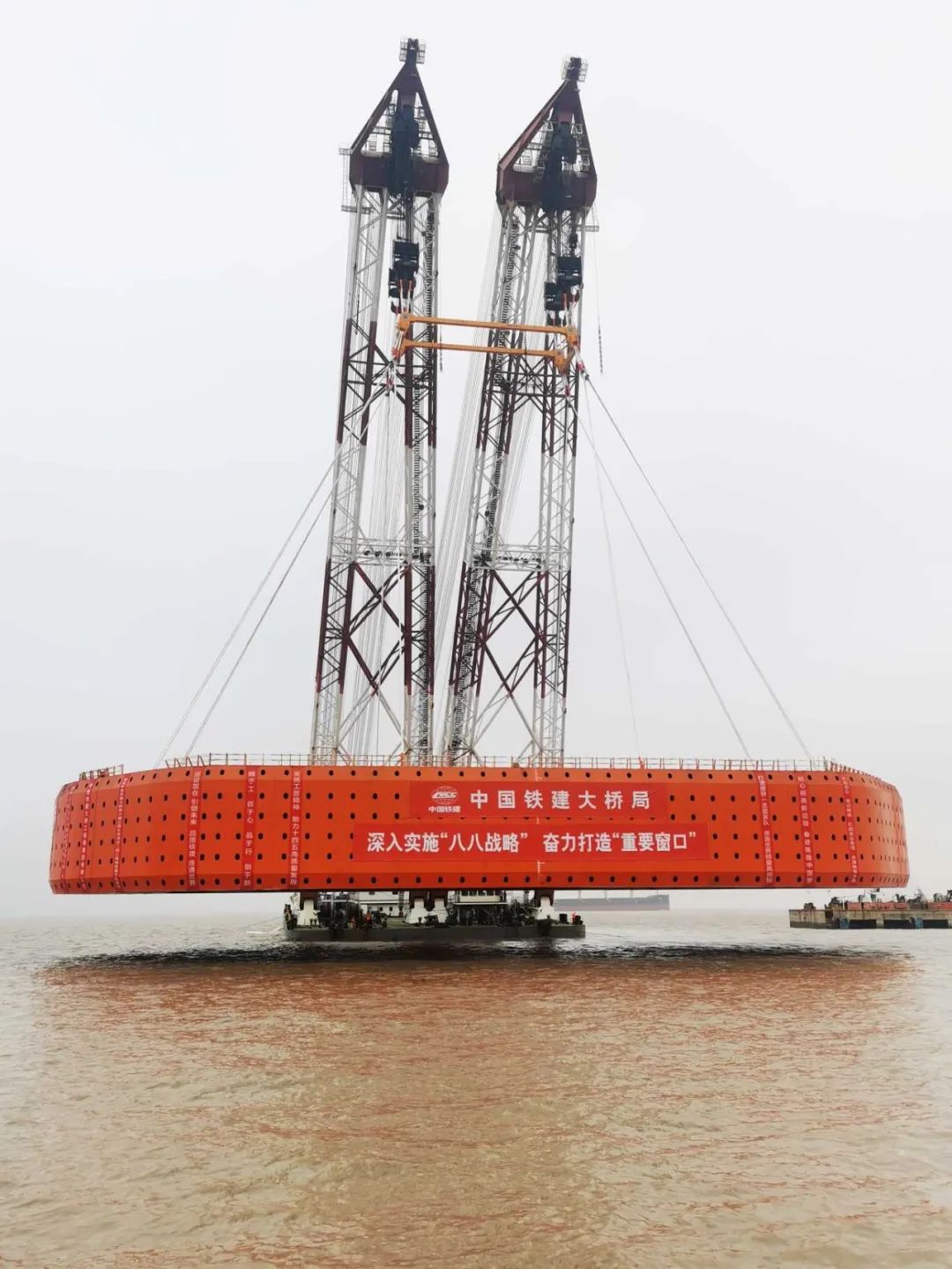 青龍門大橋是世界級跨海連島工程——寧波舟山港六橫公路大橋二期關(guān)鍵控制性工程,青龍門特大橋索塔的防撞鋼套箱,是全橋第一個永久防撞鋼套箱,總長約86米、總寬為48米,高度為9.8米,順橋向兩側(cè)鋼套箱寬度為6米,橫橋向兩側(cè)套箱寬度為10米,中間設(shè)置變寬節(jié)段。鋼套箱含底模總重約2400噸。