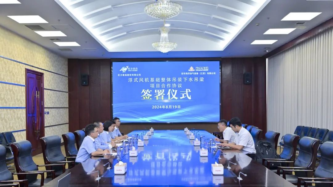 8月19日,巨力索具與宏華海洋油氣裝備(江蘇)有限公司(以下簡稱宏華海洋)就“浮式風機基礎整體吊裝下水吊梁”簽署項目合作協議。巨力索具常務副總裁李彥英、宏華海洋副總經理呂巖分別代表雙方簽署協議。巨力索具副總裁張海波、宏華海洋技術副部長李博參加會議。