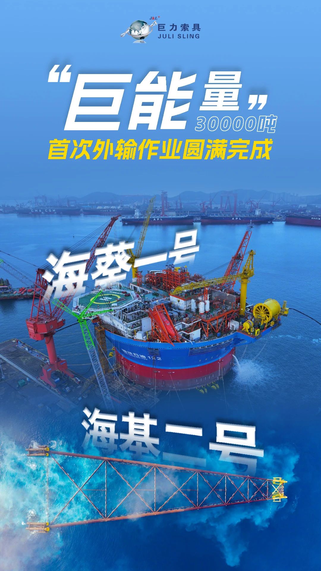 同時,巨力索具承擔了“?;枴钡牡跹b工作。2024年3月,“?;枴弊鳛閬喼薜谝簧钏畬Ч芗?,是亞洲高度最高、重量最大的導管架。巨力索具通過環形無接頭繩圈等高性能產品,確保了導管架在深海中的穩定和安全,創造了固定式海洋平臺重量、高度、作業深度等多項亞洲紀錄。