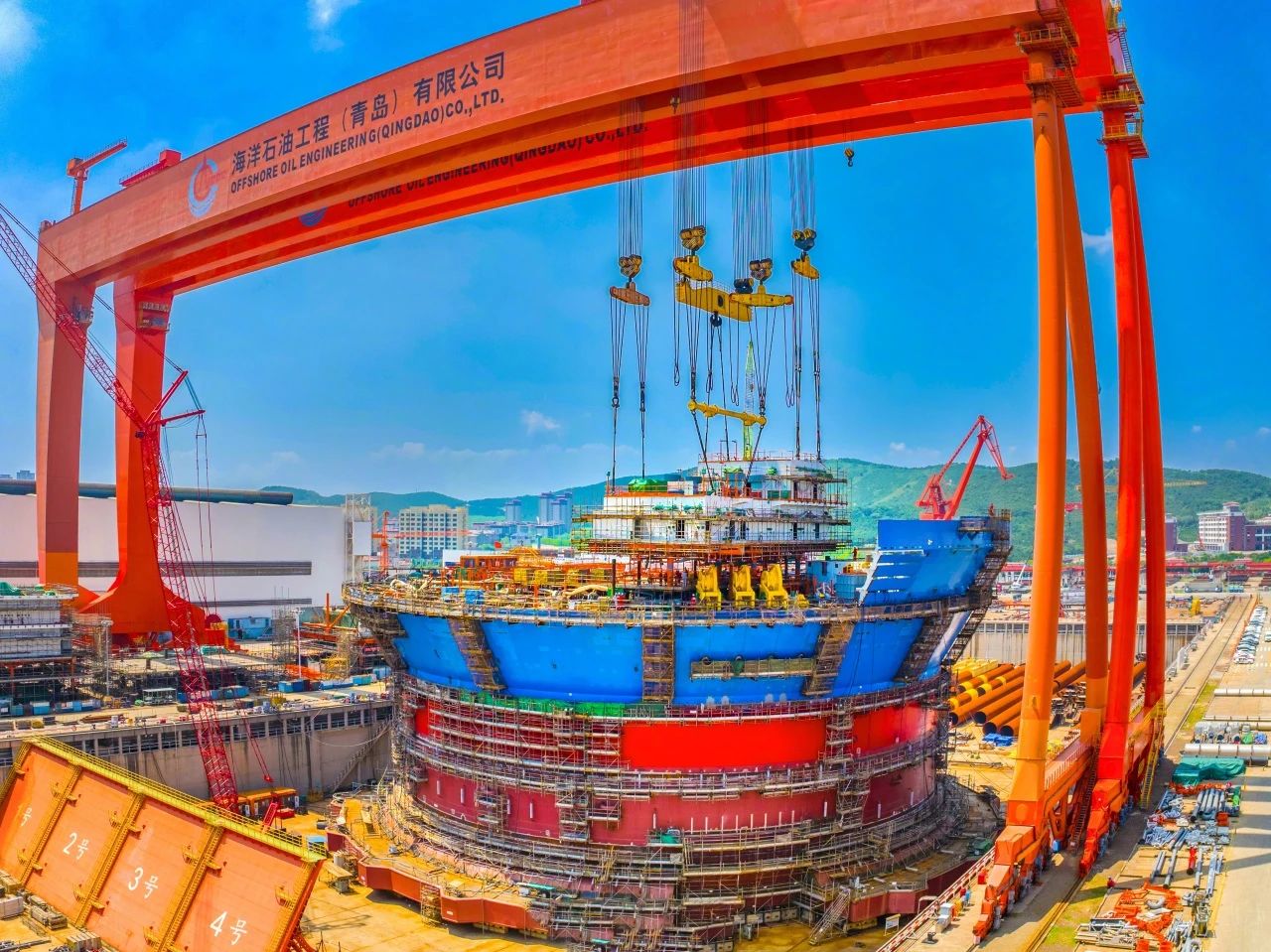2023年12月,由我國自主設計建造的亞洲首艘圓筒型“海上油氣加工廠”“海洋石油122”浮式生產儲卸油裝置——“??惶枴背壞茉赐朐谇鄭u完成主體建造,巨力索具提供800噸吊梁、400噸、500噸吊排及配套索具組成成套吊裝系統,全程配合吊裝順利進行。