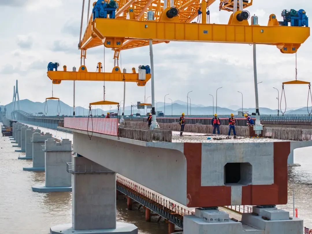 11月5日,隨著現場指揮一聲令下,國內首座市域(郊)鐵路跨海大橋,重1700噸的預制箱梁穩(wěn)穩(wěn)落至橋墩上,巨力索具箱梁吊具全程保障首榀箱梁成功架設,標志著大橋全面進入上部結構施工階段。
