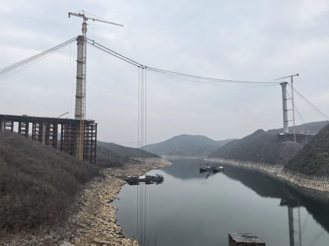丹江小三峽特大橋地處鄂豫交界的丹江口水庫庫區(qū),是連接南北交通的重要節(jié)點(diǎn)工程。大橋全長919米,主跨536米,是目前國內(nèi)最大跨徑跨峽谷分離式混合梁斜拉橋,橫跨陡峭峽谷,施工環(huán)境復(fù)雜,傳統(tǒng)吊裝設(shè)備難以滿足高空、大跨度、重載荷的作業(yè)需求。巨力索具針對(duì)項(xiàng)目特點(diǎn),量身定制了雙塔三跨式纜索起重機(jī)系統(tǒng),其跨度、起重量及智能化控制水平均達(dá)到行業(yè)領(lǐng)先標(biāo)準(zhǔn)。