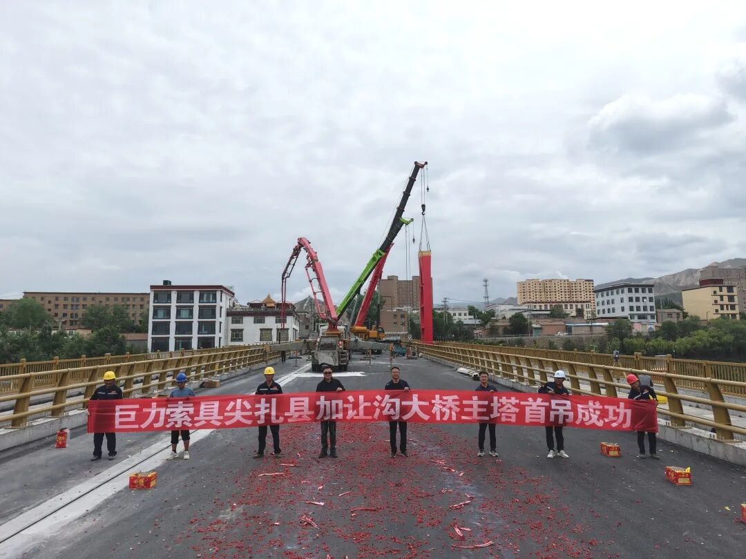 6月20日,在中國射箭之鄉(xiāng)——青海省尖扎縣的建設工地上,加讓溝大橋建設正熱火朝天地有序進行,主塔首吊作業(yè)取得圓滿成功。巨力索具股份有限公司承建了該項目的所有上部懸索結構,包括基座及主塔鋼結構,索鞍和索夾鋼結構,懸索橋主纜,吊桿用鋼拉桿及錨固鋼拉桿。巨力索具憑借其強大的綜合實力,一舉滿足了該項目的所有精密鋼構件的制作和安裝工作。