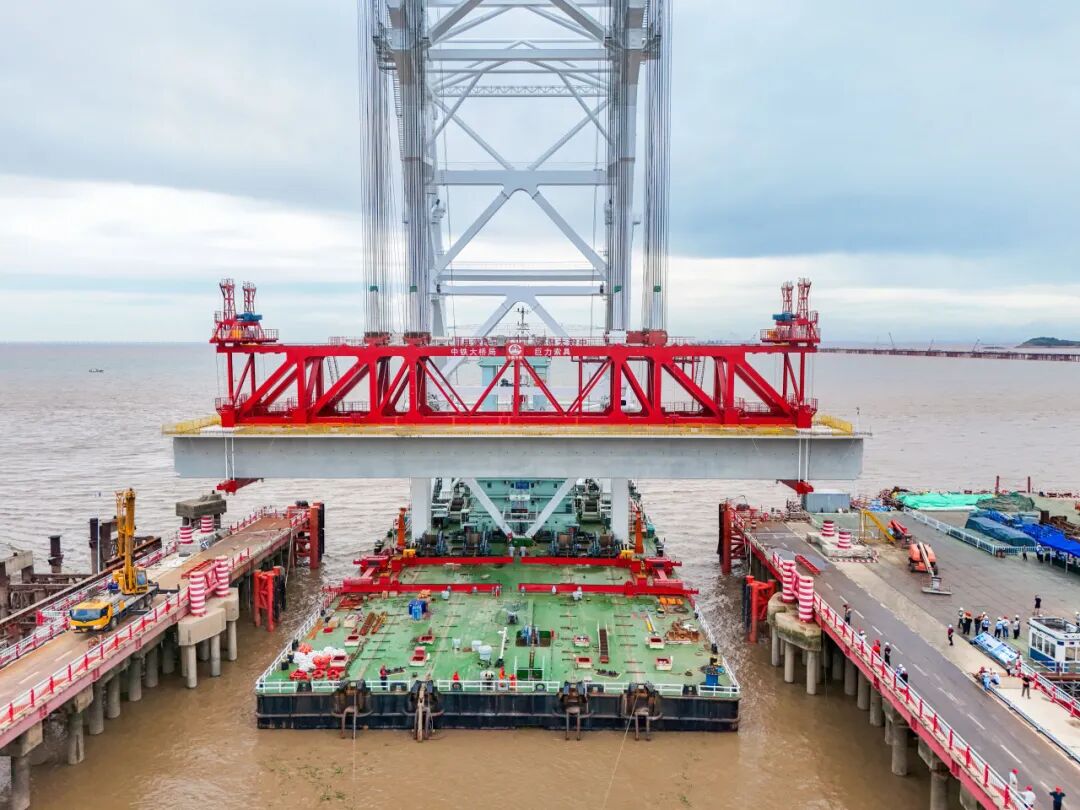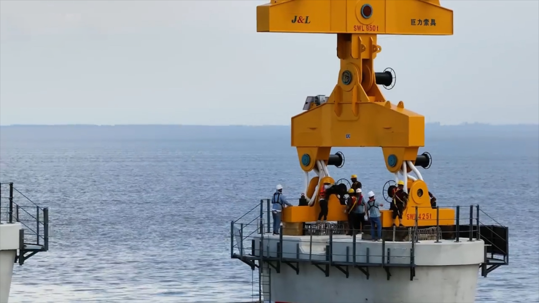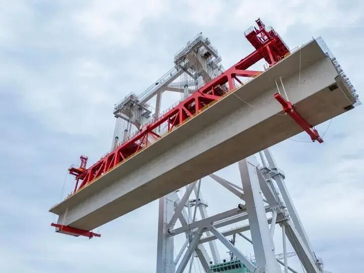 巨力索具生產(chǎn)制造的預制箱梁吊具與中鐵大橋局研制的“天一號”運架一體船協(xié)同作戰(zhàn),采用“低平潮取梁、漲潮期運輸、平潮期落梁”的精準調(diào)度方案,克服了海域潮汐變化大、海上風浪干擾強、運輸距離長等諸多施工難題,將落梁誤差控制在毫米級,最終將這新一代“世界梁王”架設到位。