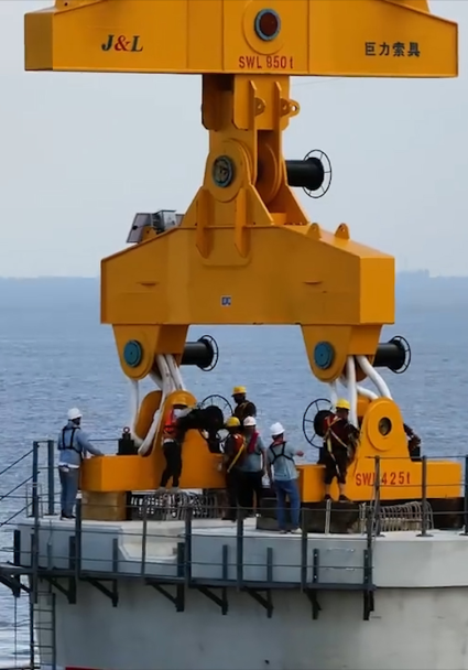 巨力索具創新開發了“一體式智能平衡吊具系統”助力杭州灣跨海鐵路橋首座預制墩身成功架設。此次預制墩身架設是世界首次在強潮海灣復雜水文條件下完成!