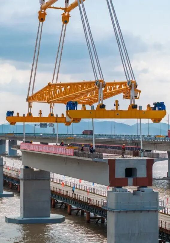 巨力索具箱梁吊具全程保障國內首座市域(郊)鐵路跨海大橋——象山線跨海大橋,重1700噸的預制箱梁成功架設。
