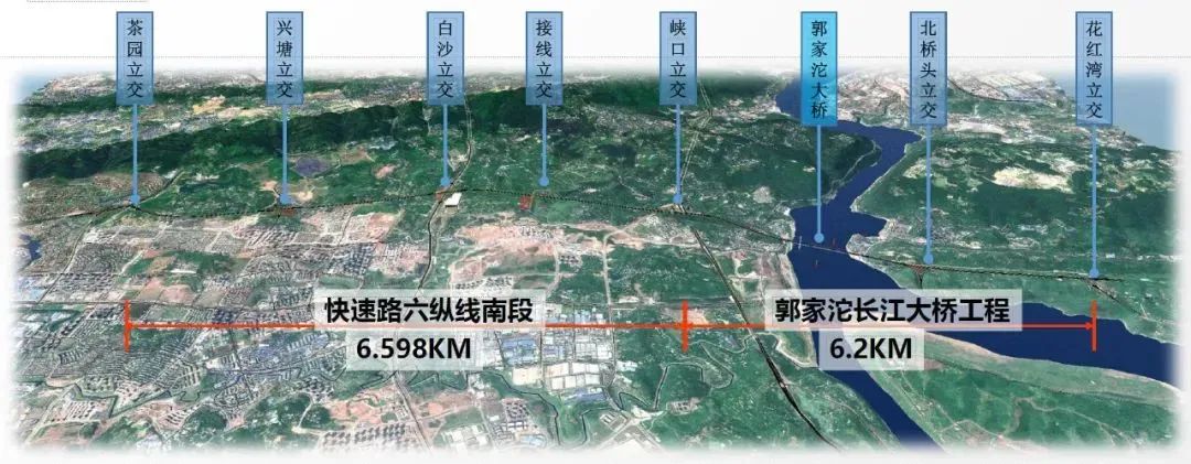 郭家沱長江大橋項目是重慶市級重點工程,也是重慶快速路“六縱線”跨長江節點工程。該項目線路北起江北郭家沱,南接南岸峽口鎮,全長6.2公里,由花紅灣立交、郭家沱長江大橋、峽口立交三部分組成。