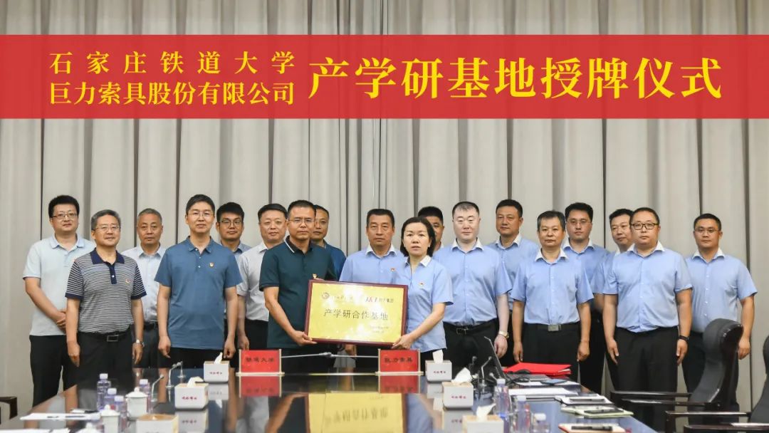 2023年7月4日,石家莊鐵道大學土木工程學院韓東海書記一行10人到訪巨力索具,雙方就產學研合作和黨建工作進行交流座談,舉行了戰略框架協議簽字儀式暨石家莊鐵道大學產學研基地授牌儀式。巨力索具常務副總裁李彥英、集團黨委副書記李天明、副總裁亢永剛接待并出席儀式。